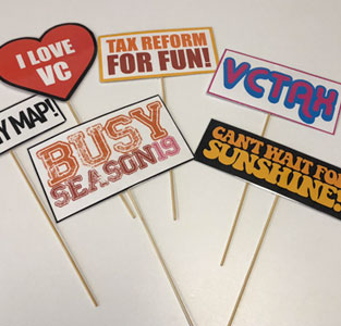 Pick up to 6 phrases or designs and we will custom make them into event stick props.